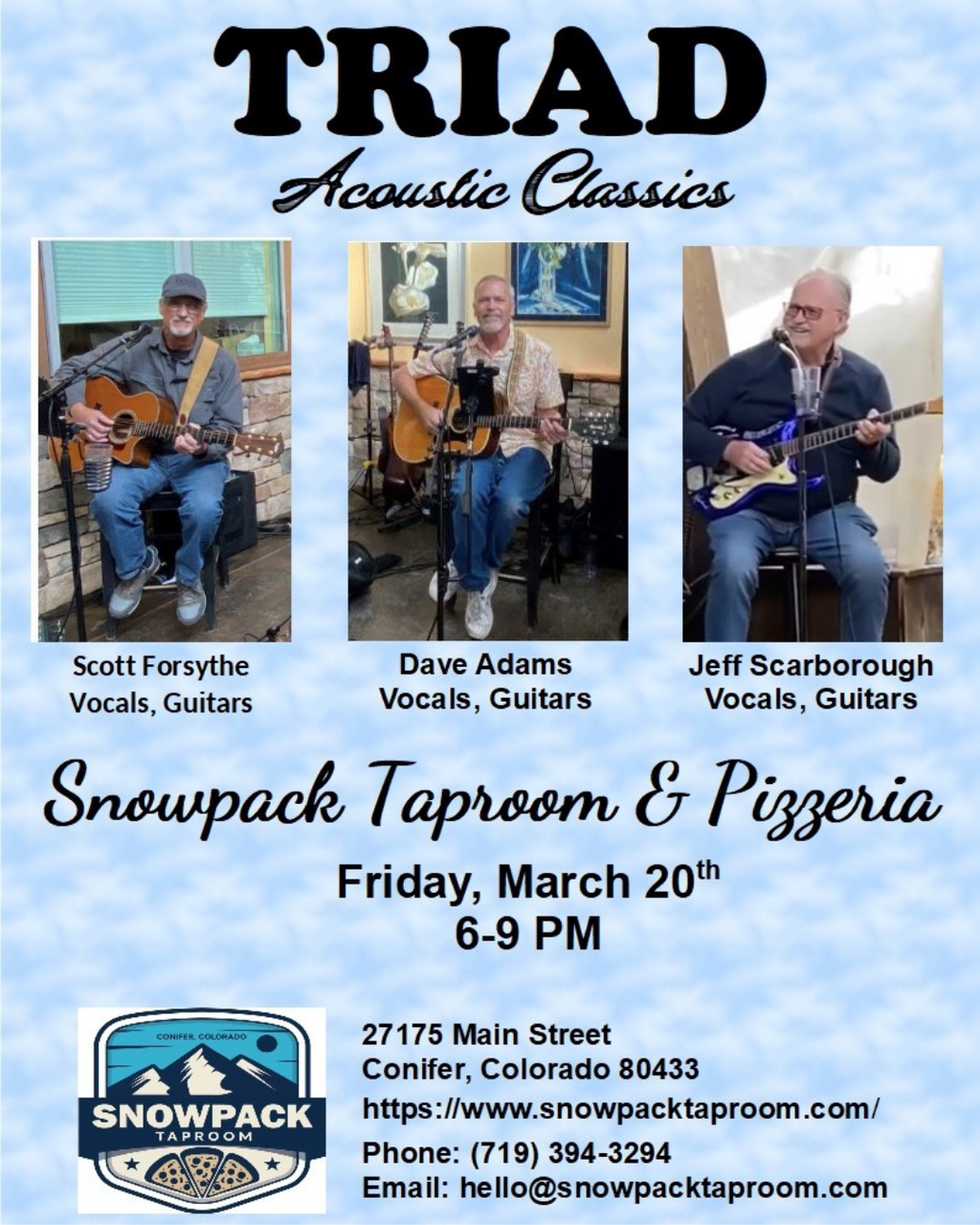 Friday, March 20th: 🎶Live Music with Triad TRIAD – Acoustic Classic Rock with Heart, Harmony, and High Altitude Soul in the Taproom at 6pm