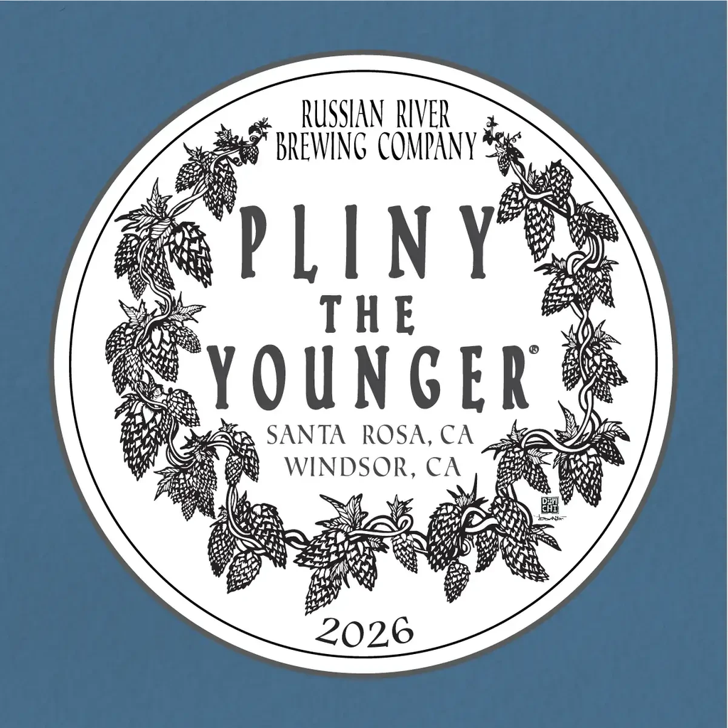 2026 Pliny the Younger via Russian River Brewing: "Pliny the Younger was first brewed as a seasonal release during the slow days of Winter 2005. As we continue to explore new hop varieties and combinations, each year we build off the previous years recipe with some slight changes. Pliny the Younger is loaded with a fresh hop aroma and flavor with notes of pine, stone fruit, citrus, and lychee. Please keep cold and enjoy fresh for the best hop aroma and flavor! 2026 Pliny The Younger is hopped with Simcoe, Amarillo, Tangier, Citra, Mosaic, Nectaron, and Warrior.